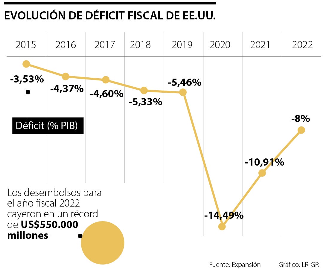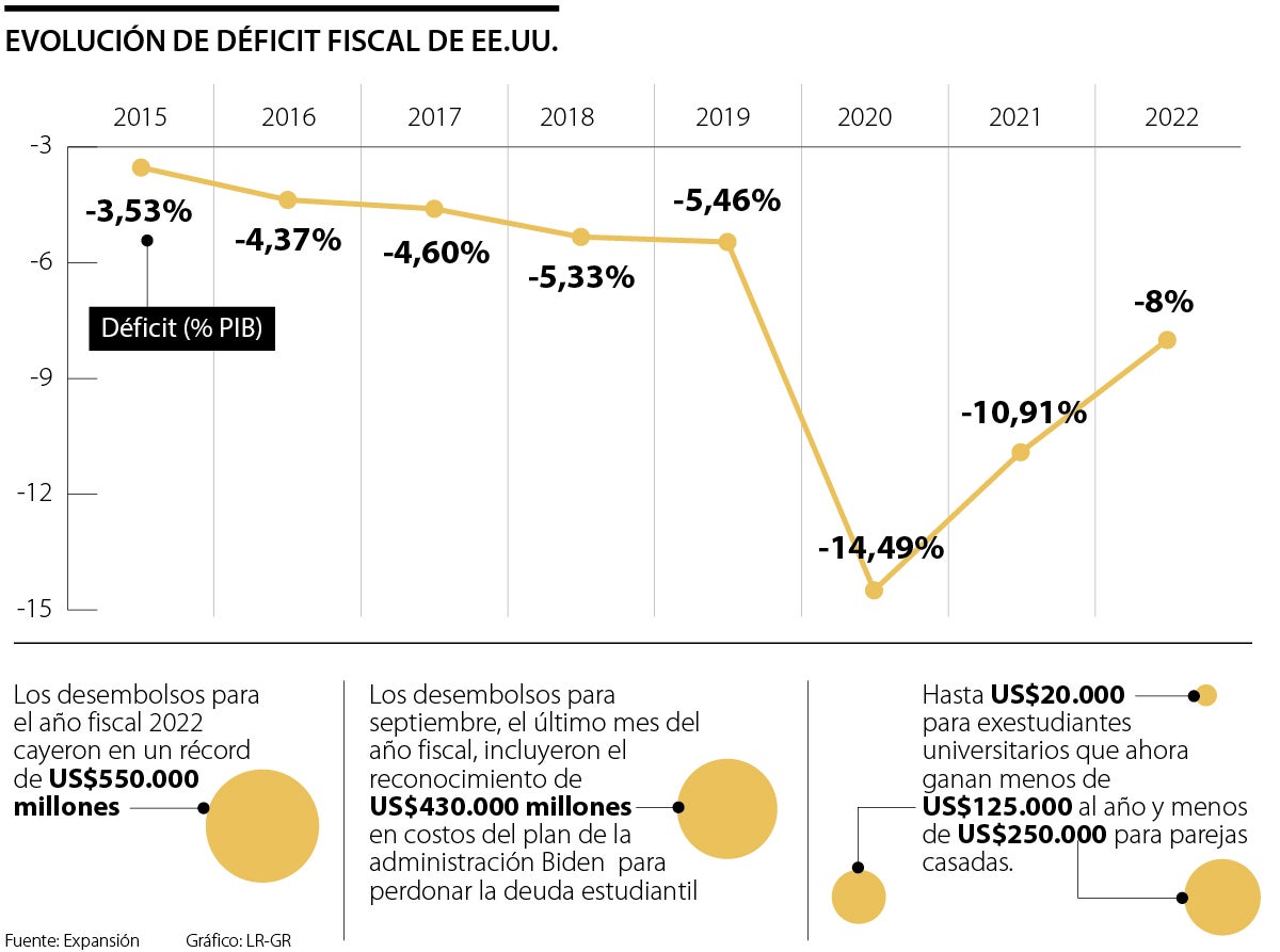 El gobierno de EE.UU. informó el viernes que su déficit presupuestario para el año fiscal 2022 se redujo a la mitad con respecto al año anterior a US$1.375 billones, debido a la disminución del gasto en ayuda de covid-19 y los ingresos récord impulsados por una economía en alza, pero estudiante los costos de condonación de préstamos limitaron la reducción.