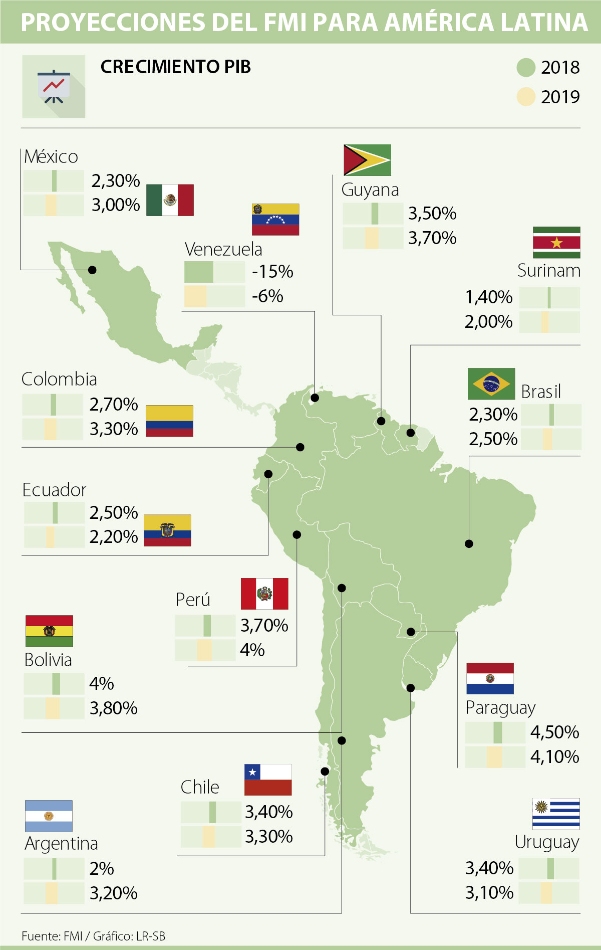 El crecimiento del PIB más alto entre los países de Sudamérica se lo lleva Paraguay con 4,50%, aunque se pronostica que caerá a 4,10% para 2019, mientras que el más bajo de la región lo tiene Venezuela, país que registra -15% para 2018 y un estimado de -6% para 2019.