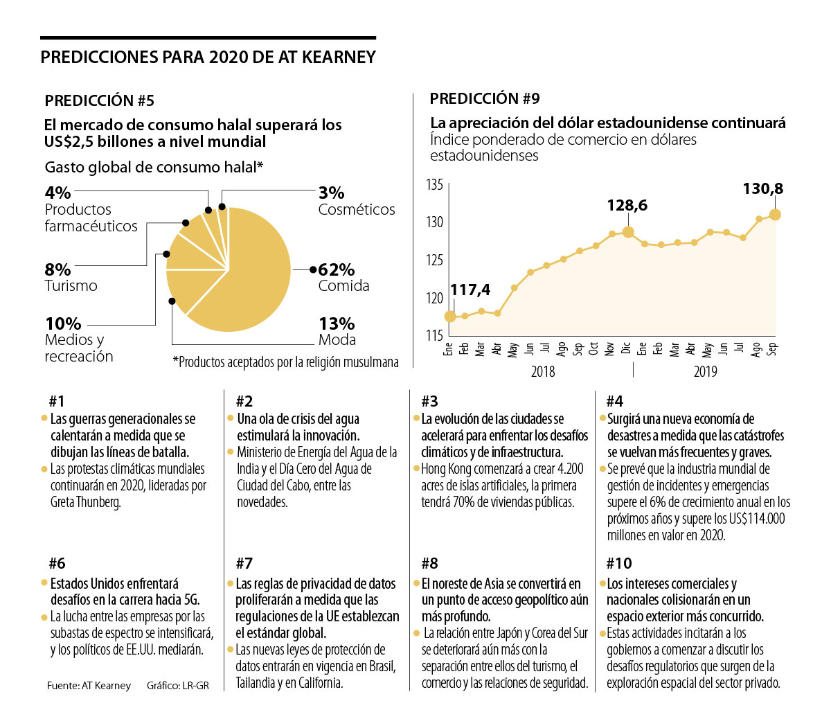 La firma AT Kearney reveló 10 predicciones sobre lo que sus expertos creen que sucederá en 2020, entre las que se destaca que continuará el descontento en la sociedad y la apreciación del dólar estadounidense. Sobre este último tema, lo que prevé es que se mantendrá fuerte frente a las principales monedas gracias a que las tasas de interés de EE.UU. son cada vez más bajas. De lo que esta firma predijo para 2019, seis anuncios se cumplieron al 100% este año y cuatro de forma parcial.