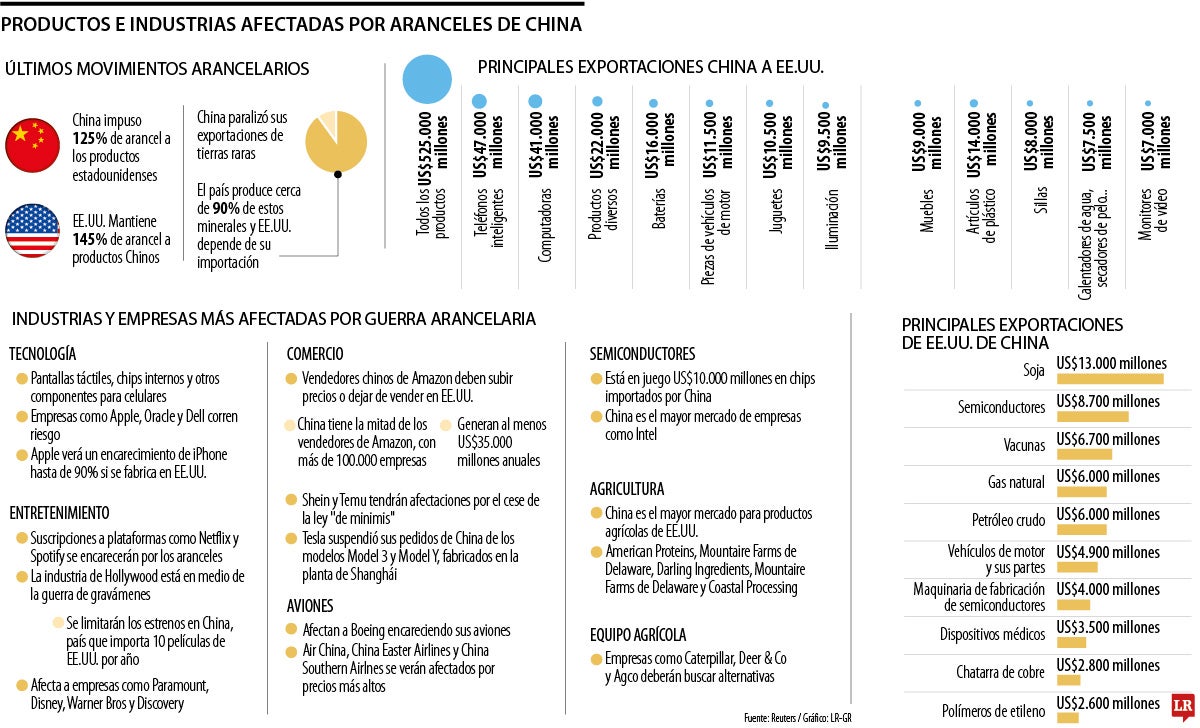 Los aranceles ponen en un limbo al menos US$525.000 millones de exportaciones Chinas a EE.UU., según cifras de Reuters. Los teléfonos inteligentes y los computadores son lo que más compra el gobierno estadounidense al país asiático, pues representan US$47.000 millones y US$41.000 millones del total. También hay otros productos en juego como las baterías (US$16.000 millones); piezas de vehículos de motores (US$11.500 millones); juguetes (US$10.500 millones); iluminación (US$9.5000) y muebles (US$9.000 millones).