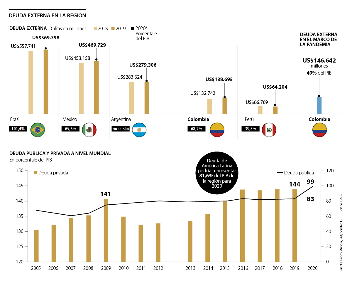 En Colombia la deuda también se incrementaría, representando 68,2% del PIB durante 2020 y 68,1% para 2021; en 2019 la deuda del país fue de US$138,695 millones según cifras del Banco Mundial, lo que habría representado 52,3% de la economía.