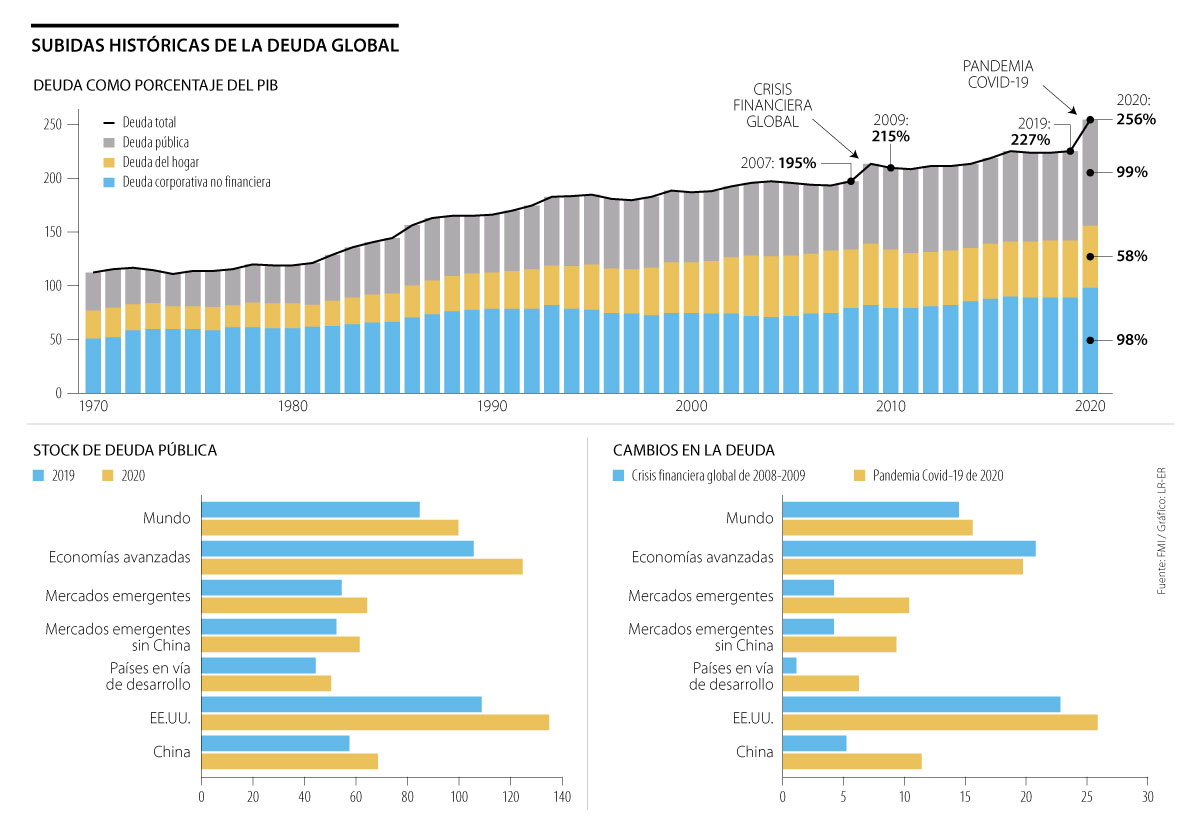 En concreto, según el organismo, la deuda global aumentó en 28 puntos porcentuales hasta 256% del PIB mundial en 2020, según la última actualización de la Base de datos de deuda global del FMI.