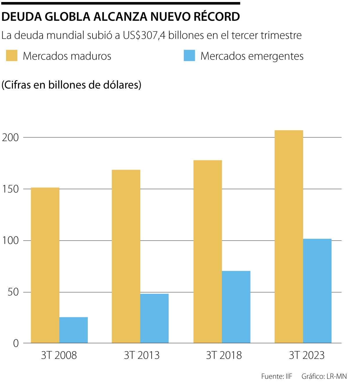 La deuda mundial subió a la cifra récord de US$307,4 billones en el tercer trimestre, y la relación deuda/PIB en los mercados emergentes alcanzó un máximo histórico, informó el jueves el Instituto de Finanzas Internacionales (IIF, por su sigla en inglés).