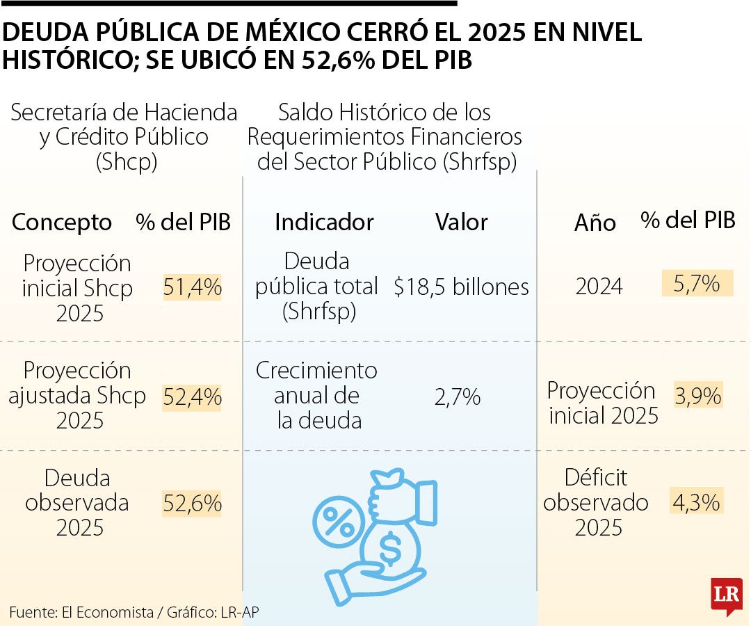 Deuda pública de México cerró el 2025 en nivel histórico; se ubicó en 52,6% del PIB