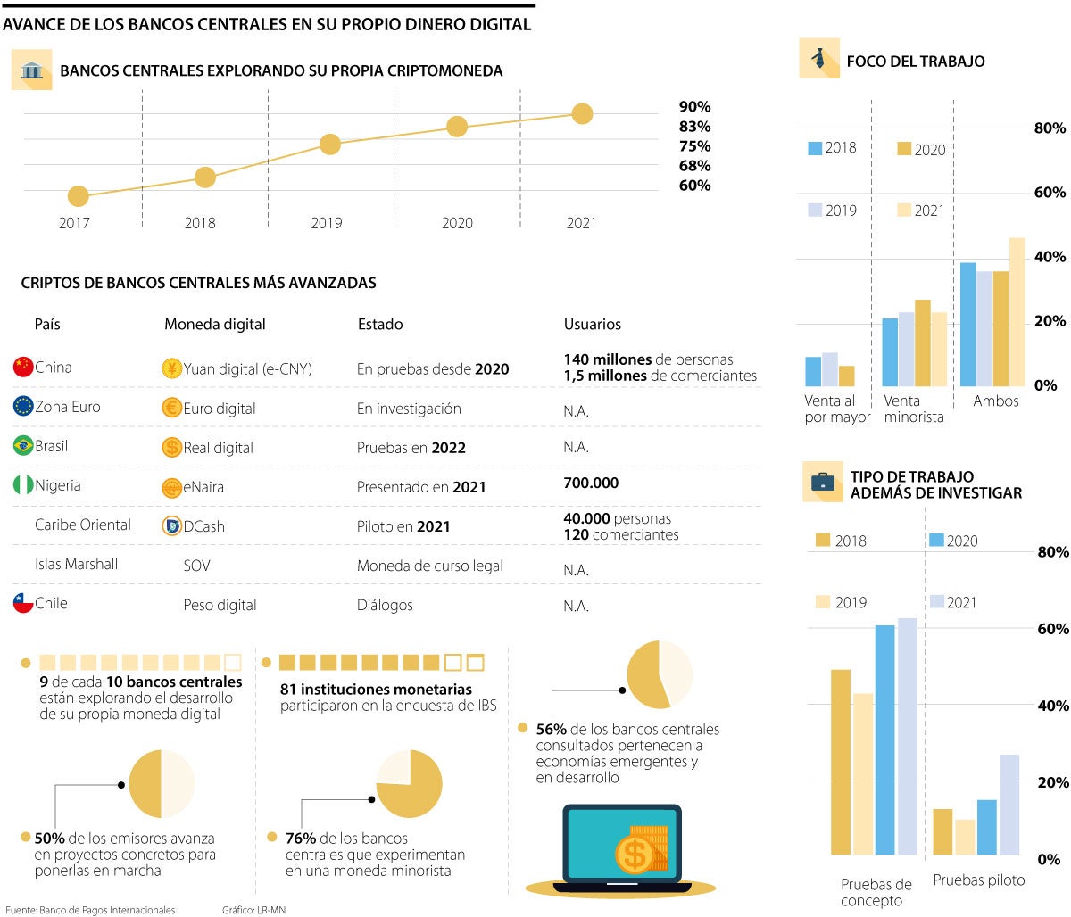 Los emisores respondieron sobre su participación o avance en la incursión de su propia moneda digital del banco central (Cbdc, por sus siglas en inglés), así como sus motivaciones e intenciones con respecto a la emisión. También reveló que más de la mitad de los bancos centrales ya están desarrollando sus propias criptomonedas.
