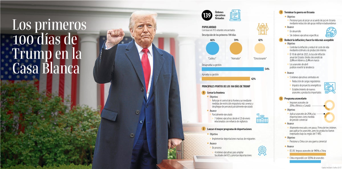 Donald Trump completa hoy 100 días en la Casa Blanca. Sus políticas han marcado el camino de Estados Unidos con una guerra arancelaria, planes antimigración, cierre de fronteras, recortes burocráticos federales y cambios fiscales. Desde el 20 de enero, el mandatario ha firmado 139 órdenes ejecutivas y su popularidad ha caído entre los electores en tres meses.