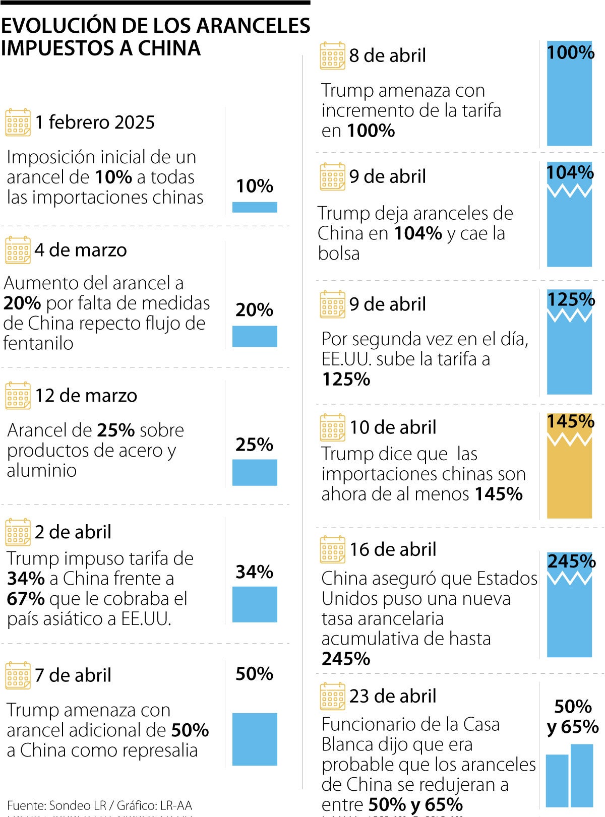 Un alto funcionario de la Casa Blanca dijo que era muy probable que los aranceles de China se redujeran entre 50% y 65%, pero aún no se ha tomado una determinación oficial. De igual manera, Donald Trump dijo que estaba dispuesto a recortar los aranceles a los bienes chinos, diciendo que los aranceles de 145% que impuso a China pueden bajar.