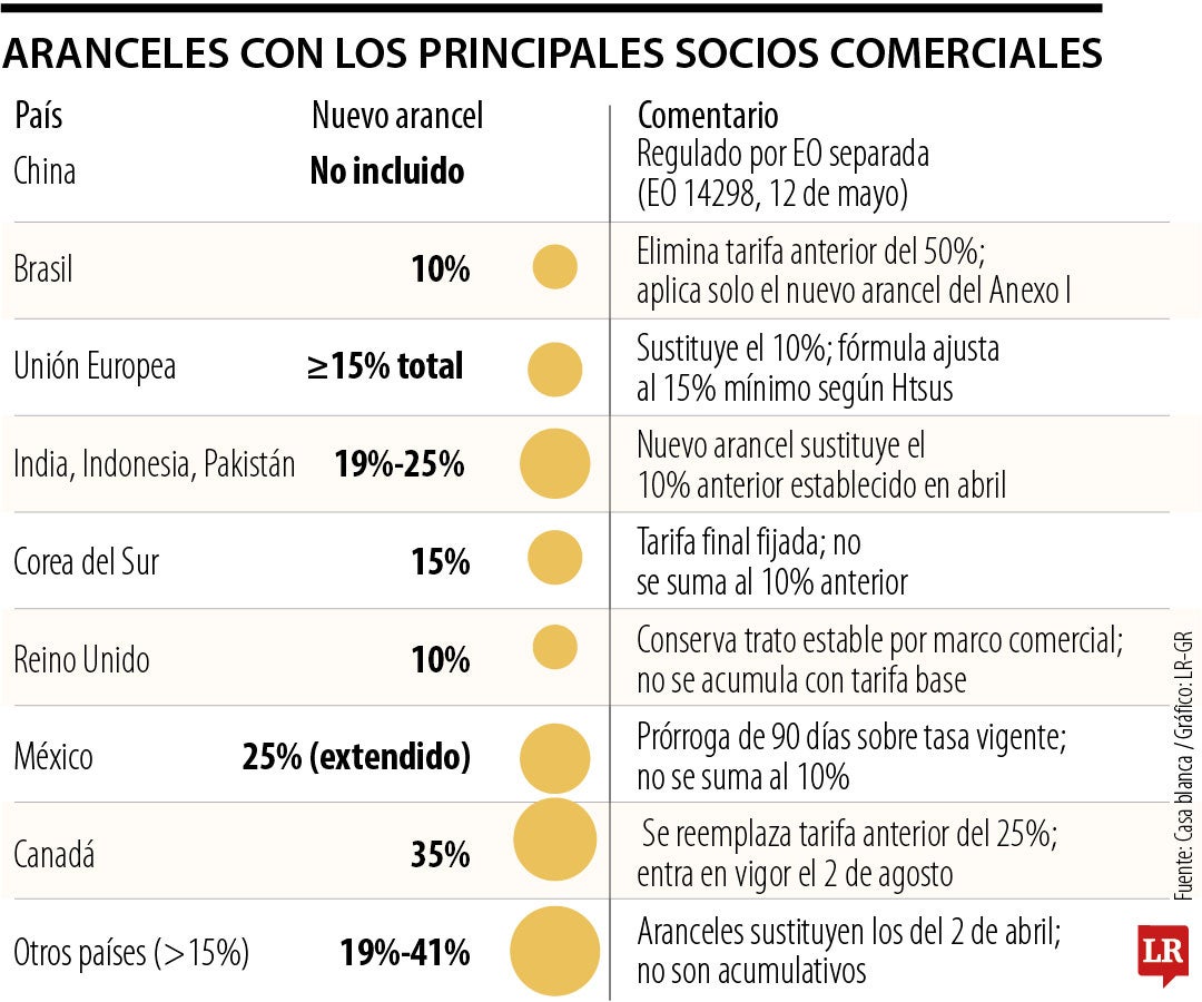 Se acabó la espera, los aranceles finales a los principales socios de EE.UU. ya fueron publicados por el presidente Donald Trump y entrarán en vigor a partir del 7 de agosto. Para los principales socios comerciales ajustó una tarifa que va entre 15% a 50%, unas tarifas que sustituyen a la impuesta el pasado 2 de abril.