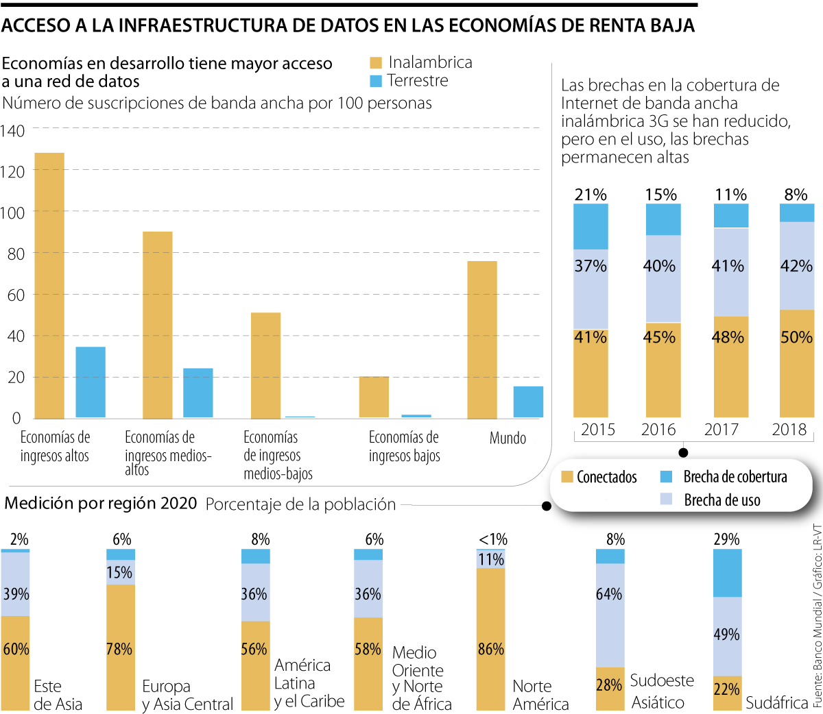 De acuerdo con el informe ‘Data for Better Lives’, presentado por el Banco Mundial, durante 2020: cerca de 600 millones personas alrededor del mundo vivieron sin acceso a internet; otros 3.800 millones no utilizaron el recurso, aun teniendo una señal de banda ancha móvil disponible; y 48% de los residentes en países de economía emergentes tuvieron dificultades para pagar el uso de datos móviles. En tanto, 42% de los usuarios restringió con frecuencia la cantidad de datos que usa.