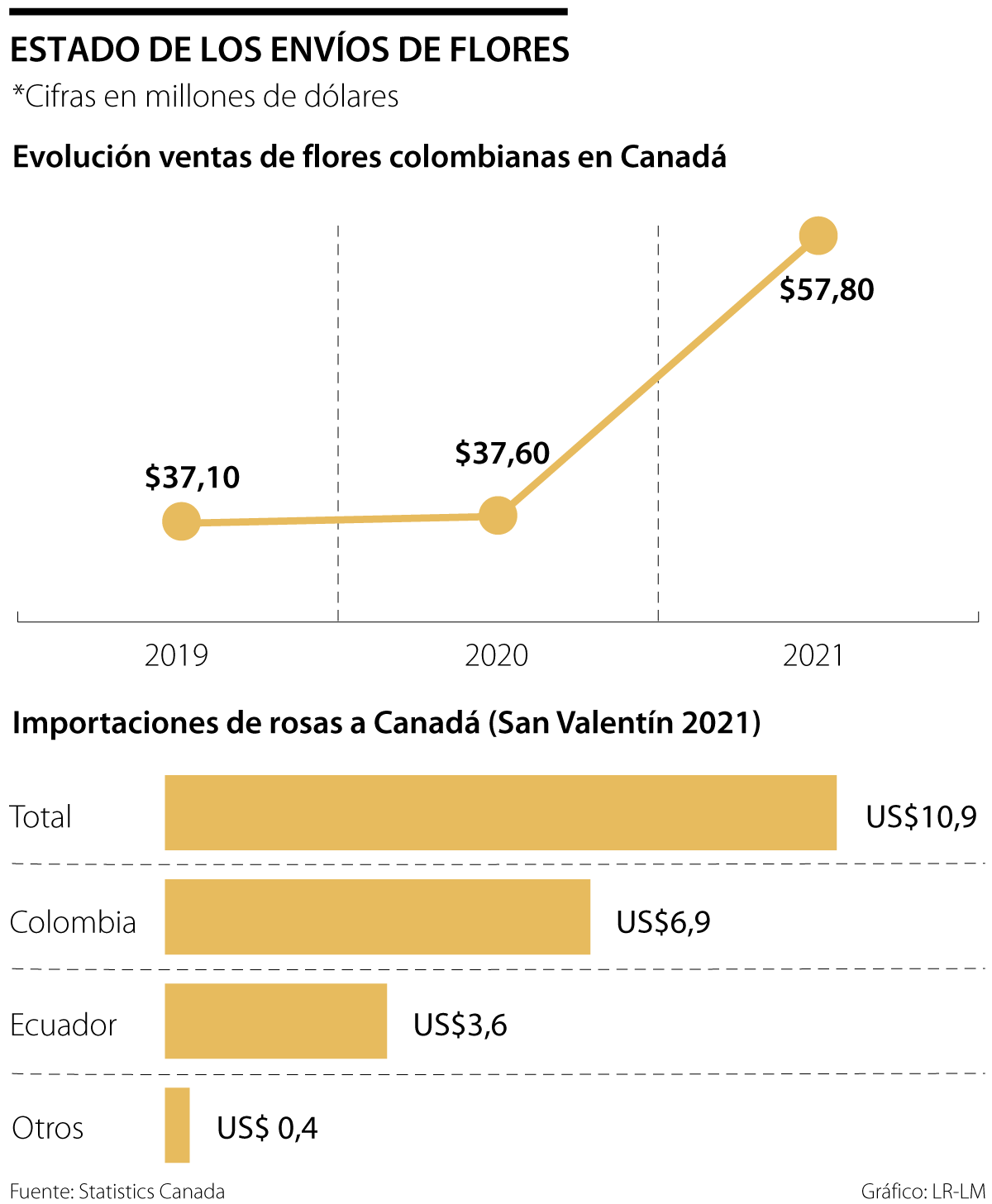 Solo en febrero de 2021 Canadá importó casi US$11 millones en rosas. De estos, US$6,9 millones fueron pagados a varios productores colombianos. En volumen, las cifras oficiales reportadas por Statistics Canada, dan cuenta de que las rosas colombianas representan cerca del 60% de las importaciones de este producto.