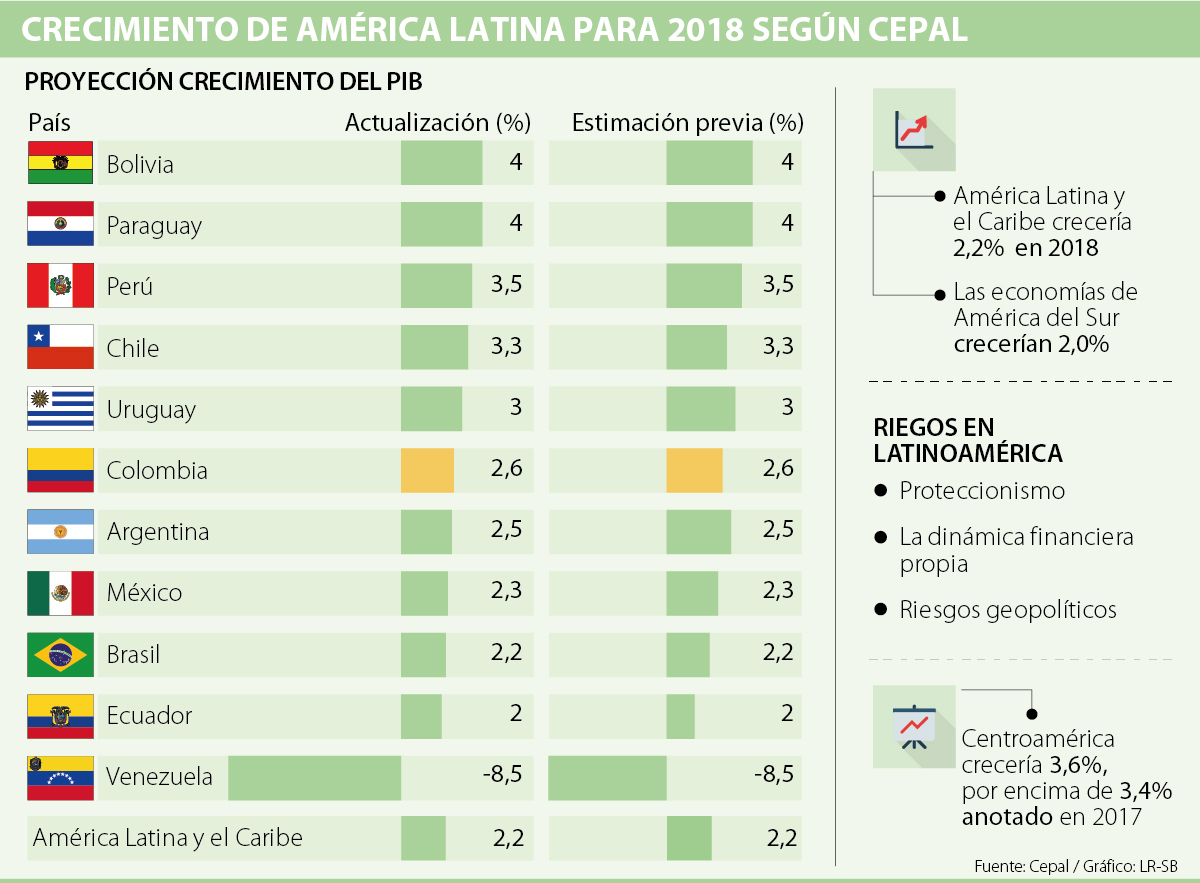 La economía colombiana podría crecer 2,6% en 2018, según las últimas proyecciones de la Comisión Económica para América Latina y el Caribe (Cepal). Este organismo dio a conocer la actualización de sus previsiones este miércoles, en las que además mantuvo la proyección de 2018 para Latinoamérica y el Caribe, región que, después de decrecer 1,2% en 2017, podría lograr un crecimiento de hasta 2,2%.