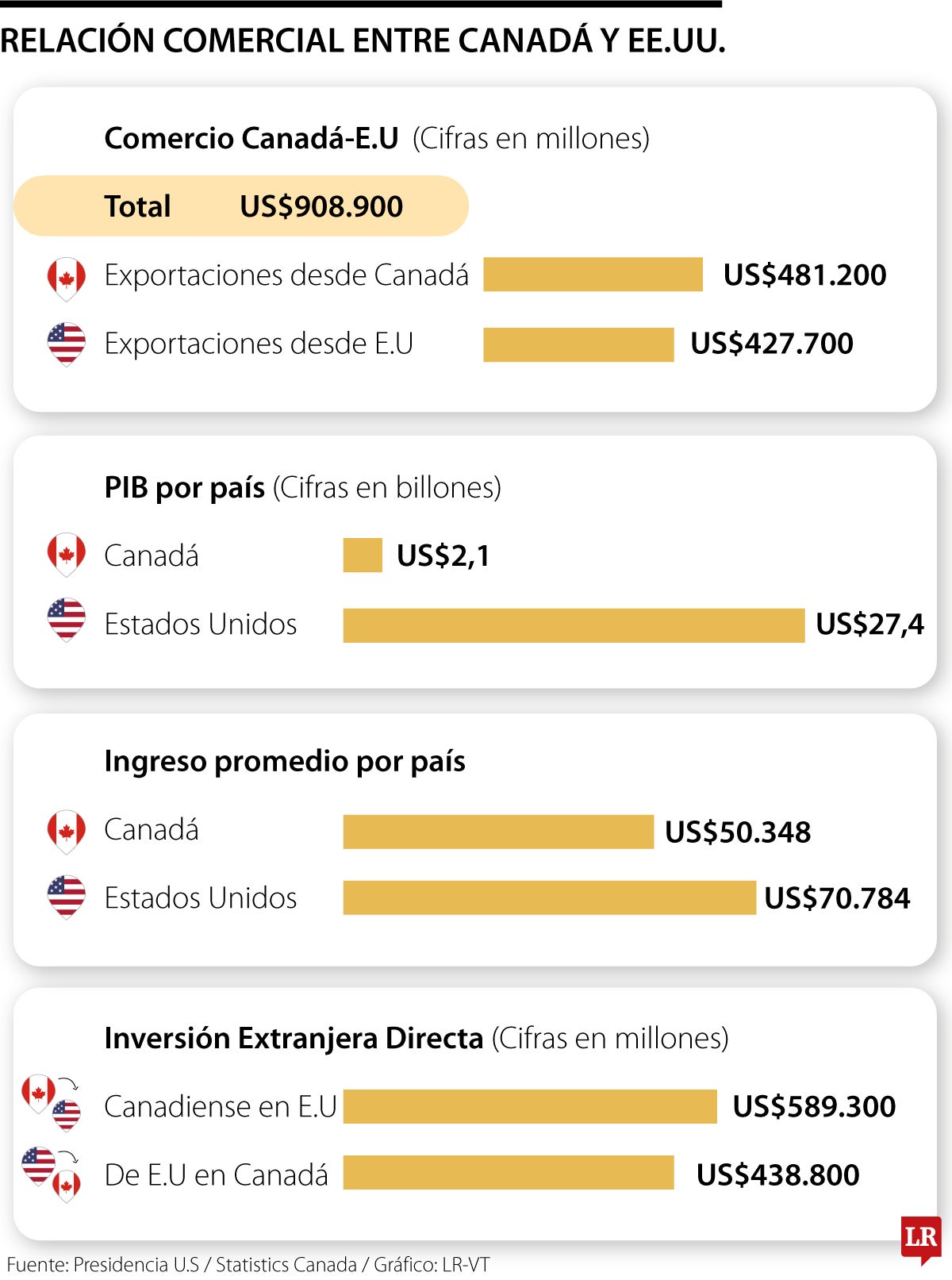 Según el Departamento de Estadísticas de Canadá, el comercio bilateral alcanza los US$908.900 millones, de los cuales US$481.200 millones, es decir, 53%, corresponden a exportaciones canadienses hacia Estados Unidos. Lo que refuerza el argumento del impacto en el costo de vida para los estadounidenses en caso de imponerse dicha tarifa anunciada por Trump.