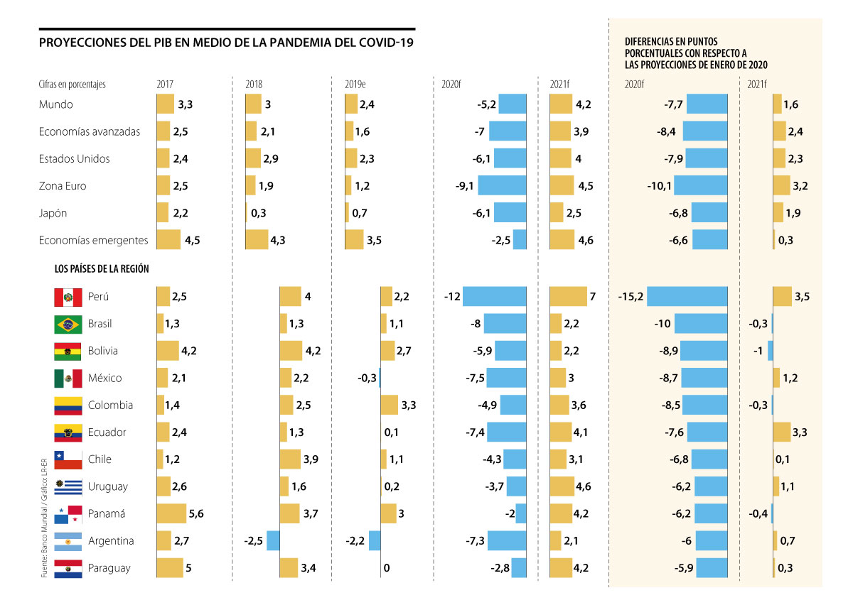 La nueva proyección del Banco Mundial para la región equivale a una diferencia de nueve puntos porcentuales con respecto a las proyecciones de enero de 2020, momento en el que se estimó que el PIB del vecindario se expandiría 4,6%. Los países a los que más les bajaron las proyecciones fueron Perú y Brasil, con 15,2 y 10 puntos porcentuales, respectivamente, y así se convierte en los que más caerían.