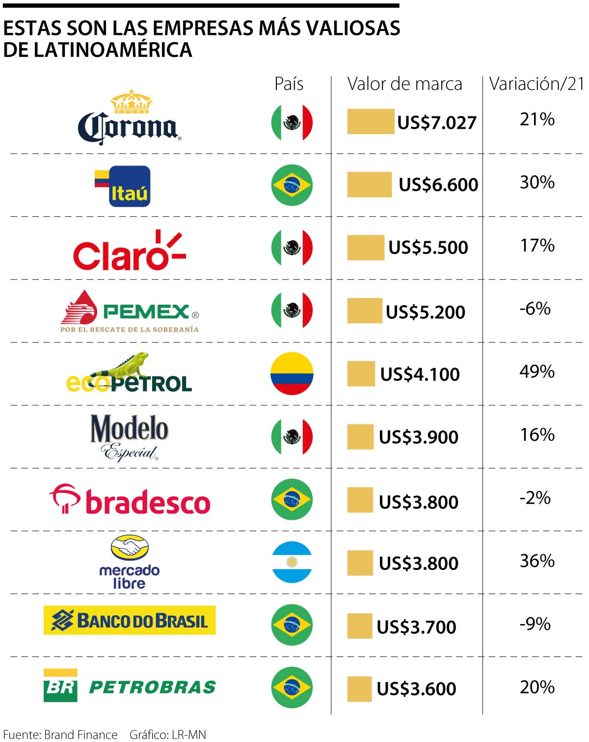 El ranking de las empresas latinas más valiosas quedó de la siguiente forma. Corona, como se mencionó, es la líder. La compañía mexicana encabezó el ranking con un aumento en su valor de marca de 20,7%, que ya alcanza los US$7.027 millones, ubicándose como la empresa mexicana más valiosa por tercer año consecutivo. “Como ya vimos en el informe Brand Finance Global 500 2022, Corona se ha enfrentado al impacto de la pandemia apostando con éxito por la diversificación y la inversión en nuevos productos”, dice Brand Finance.