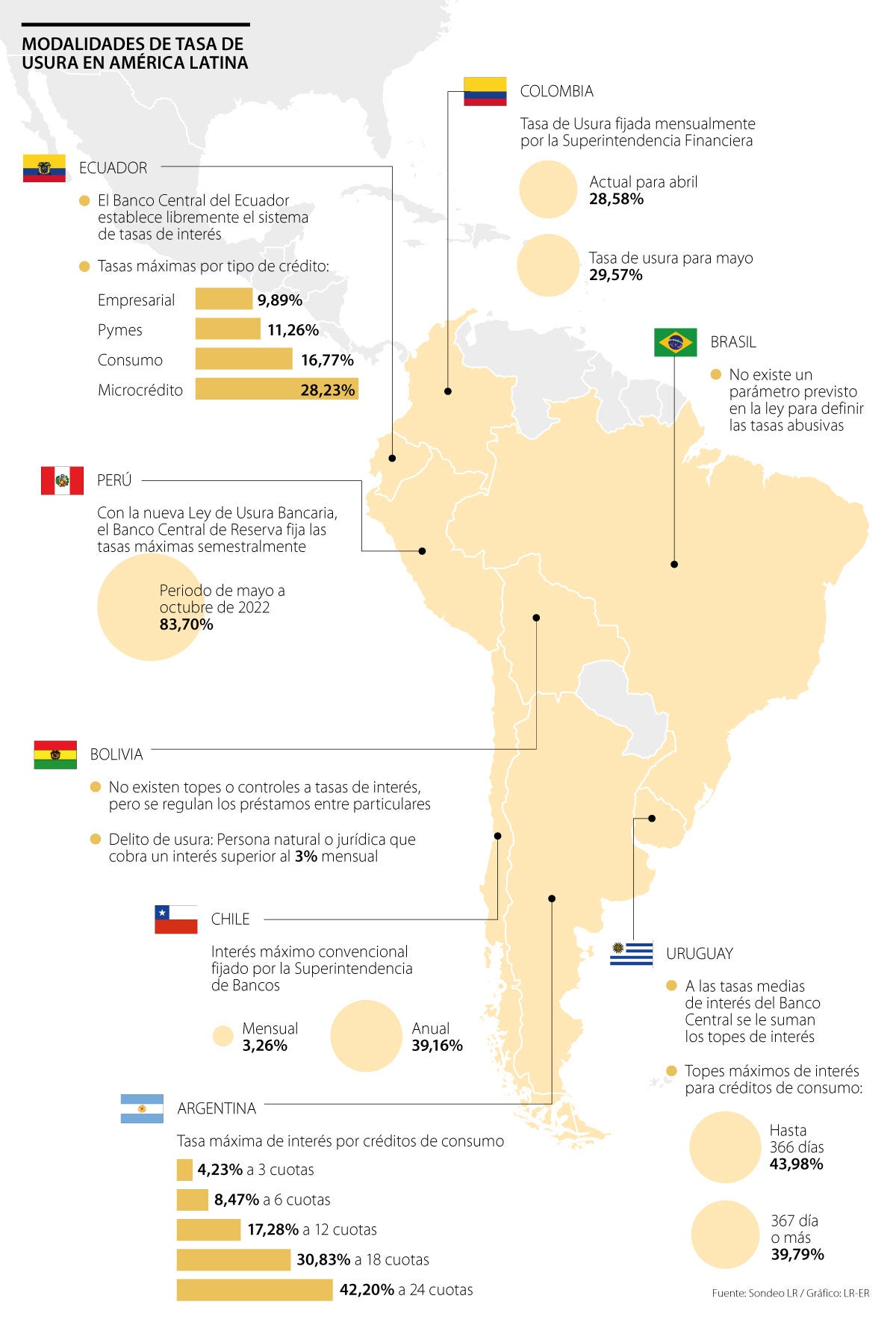 En Ecuador y Argentina el límite máximo a los intereses son de 16,77% y 17,28%, mientras que en Perú y Uruguay son 83,7% y 43,9%
