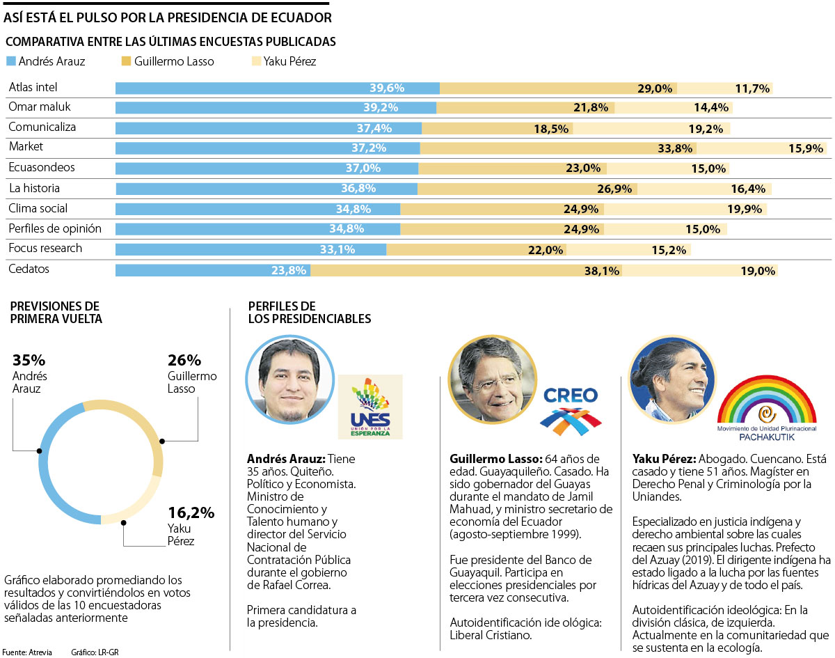 Los resultados de los sondeos de opinión se podrían catalogar en tres grupos: en primer lugar, los que indican que el candidato del correísmo, Andrés Arauz, estaría próximo a ganar en una sola vuelta, logrando una votación que se ubicaría entre 36% y 39% de sufragios válidos, con alrededor de diez puntos de ventaja sobre Guillermo Lasso.