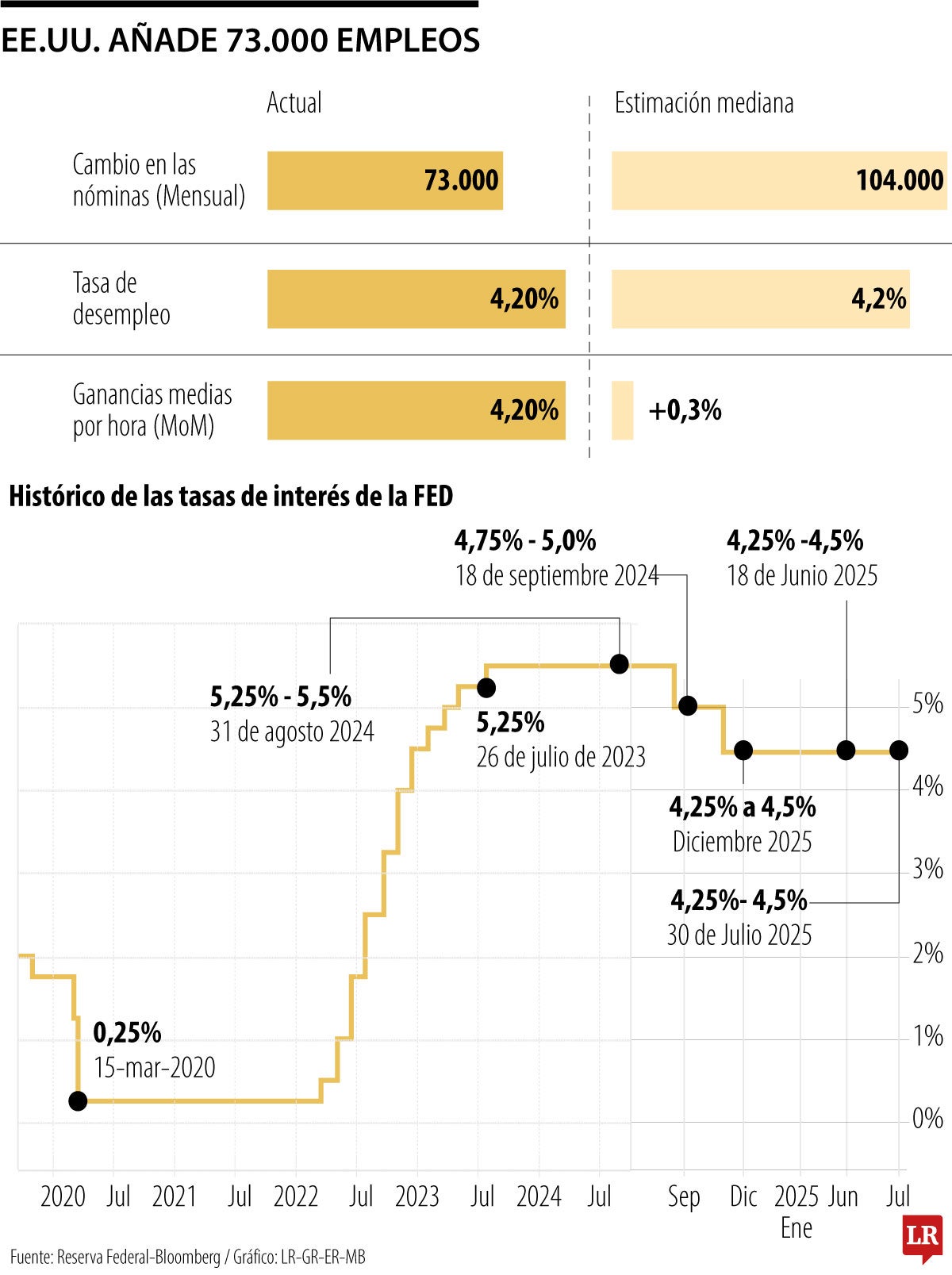 Las nóminas aumentaron en 73.000 en julio, tras una revisión a la baja de casi 260.000 en los dos meses anteriores, según un informe de la Oficina de Estadísticas Laborales publicado el viernes. La tasa de desempleo ascendió a 4,2%.