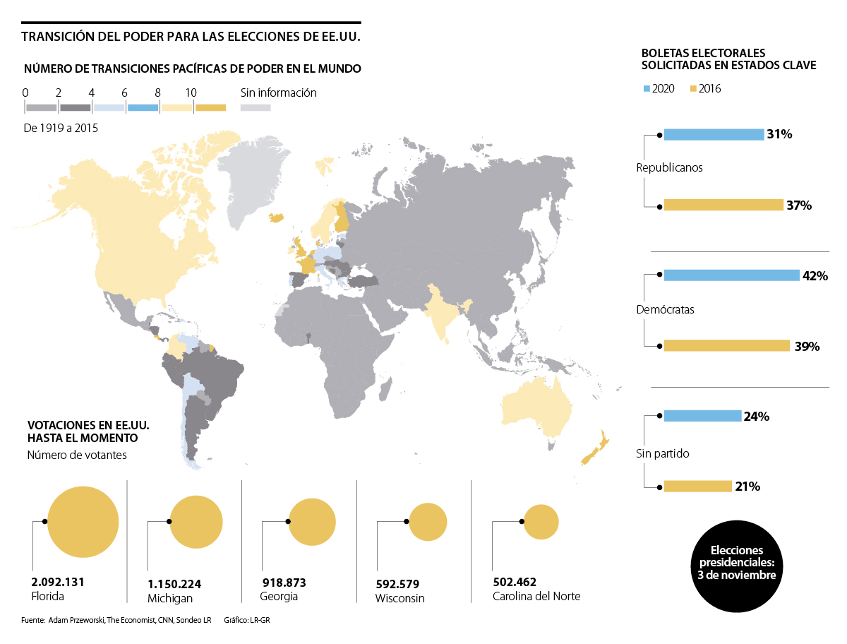 A pesar de no haber certezas para los resultados de noviembre, todo indica que en caso de que Biden llegue al poder no habría pleito del lado de Trump, al menos de forma directa, lo que mantendría el registro de EE.UU. de tener un gran numero de transiciones pacíficas.