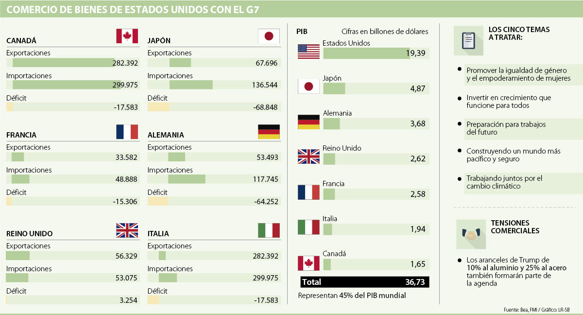 Cinco temas componen la agenda oficial de la cumbre del G7, pero solo uno centró los momentos previos al encuentro entre Estados Unidos, Japón, Reino Unido, Italia, Francia, Alemania y Canadá: los aranceles y el proteccionismo de Donald Trump, quien llegó ayer a una reunión con un grupo de economías con las que en su mayoría tiene déficit comercial.