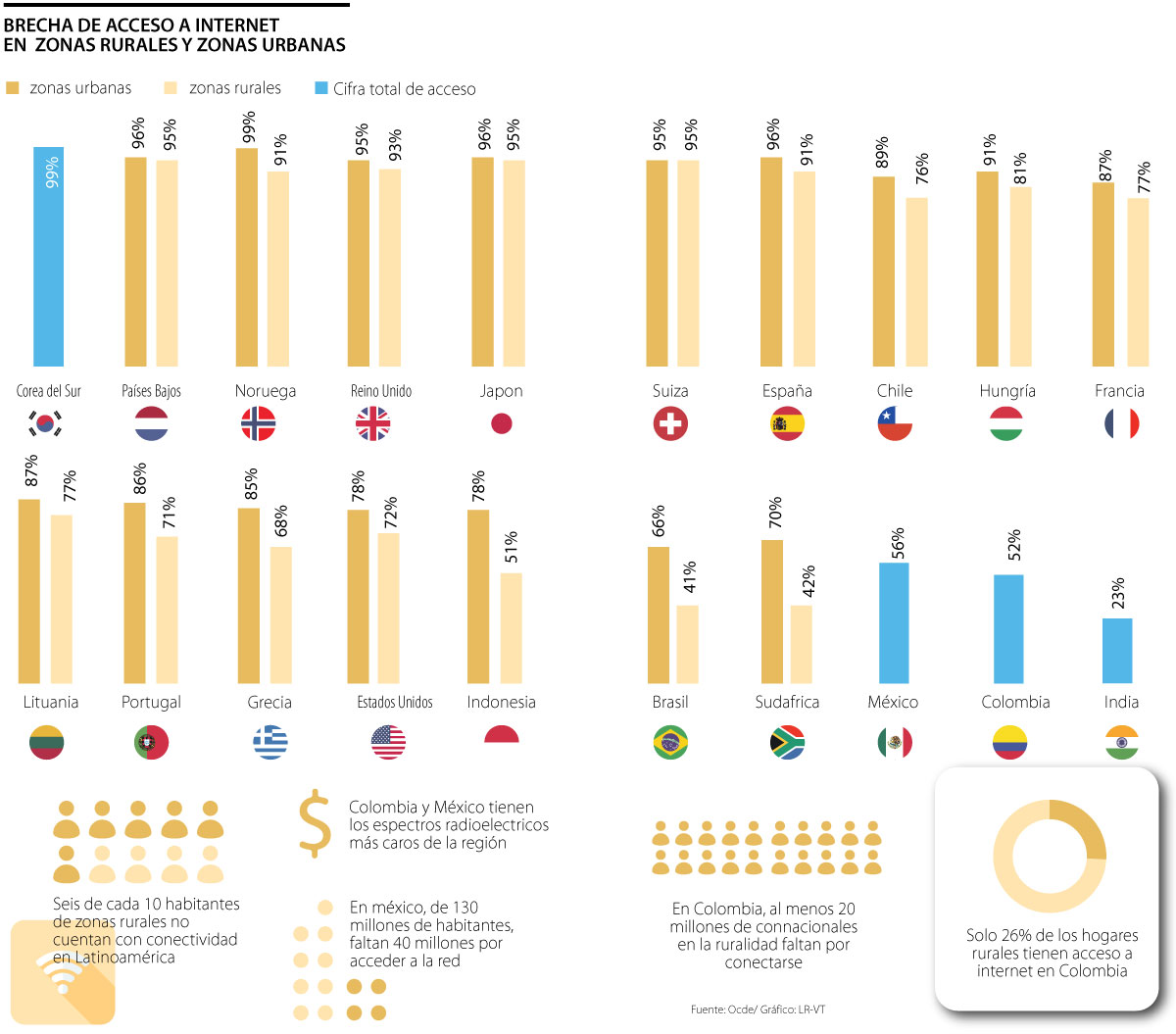 Un informe publicado por la Ocde sobre la accesibilidad de los países al internet y la brecha existente entre las zonas urbanas y rurales, evidenció que, en países en desarrollo, hay una brecha digital de entre 5% y 10%, mientras que en territorios poco desarrollados puede haber una diferencia de acceso de hasta 30%, además, varios estudios de la misma organización aseguran que solo 40% de hogares rurales acceden a internet en América Latina.