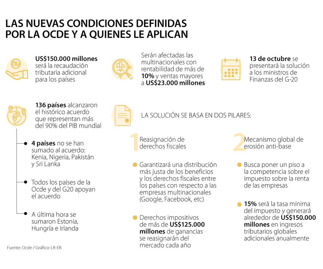 “El acuerdo histórico, alcanzado por 136 países y jurisdicciones que representan más del 90% del PIB mundial, también reasignará más de US$125.000 millones de beneficios procedentes de alrededor de las 100 mayores y más rentables empresas multinacionales a países de todo el mundo, lo que asegurará que dichas empresas paguen la parte equitativa de impuestos que les corresponda, con independencia de donde lleven a cabo sus actividades y generen los beneficios”, precisó la Ocde en un comunicado.