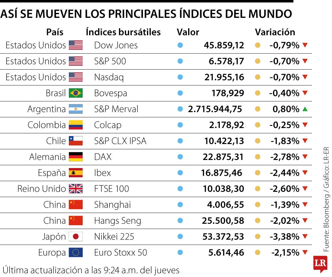 El S&P 500 cayó 1% a las 9:30 am, hora de Nueva York, el Nasdaq 100 cayó 1,3%, el Promedio Industrial Dow Jones cayó 0,7%, el índice Stoxx Europe 600 cayó 2,7% y el índice MSCI World cayó 1,4%.
