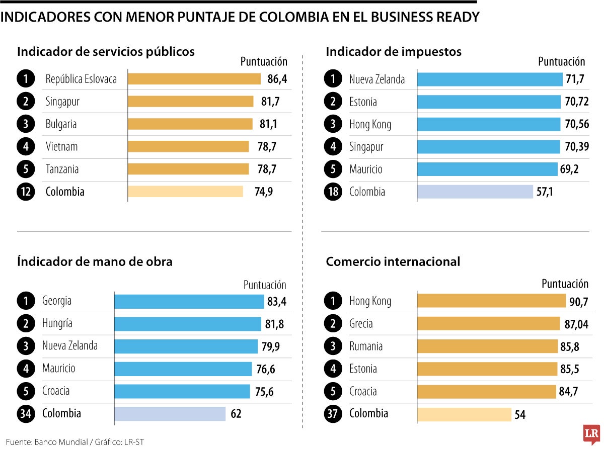 De la decena de indicadores que componen el informe del Business Ready 2024, hubo cuatro en los que Colombia no logró clasificarse entre los 10 primeros países (sobre 50); por el contrario estuvo fuera de esas casillas con puntaje aceptable o regular (si se compara con las otras 49 economías estudiadas).