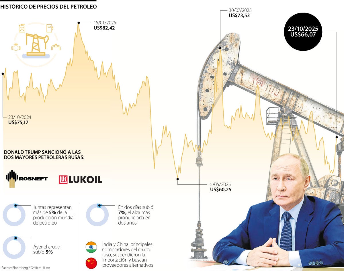 El precio de referencia brent subió 5% ayer y alcanzó un valor de US$66 por barril. EE.UU. busca presionar a Vladimir Putin para que acepte un acuerdo con Ucrania y ponga fin a la guerra. El avance del brent en los últimos dos días es, según Reuters, el más pronunciado en los últimos dos años. Ayer, el precio avanzó cerca de US$3,37 para la referencia brent, mientras que el West Texas Intermediate sumó US$3,33; fue un avance de 5,7% a un precio de US$61,8.
