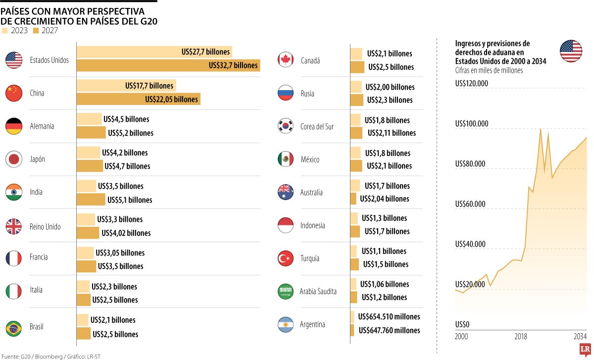 En la organización del comercio explicaron que las normas más restrictivas perjudicarán el PIB global, las proyecciones dejan ver que EE.UU. llegaría a 2027 con un valor de US$32,7 billones en su economía, le siguen China con un estimado de US$22,05 billones, Alemania (US$5,2 billones), Japón (US$4,7 billones) y en quinto lugar India con US$5,1 billones.