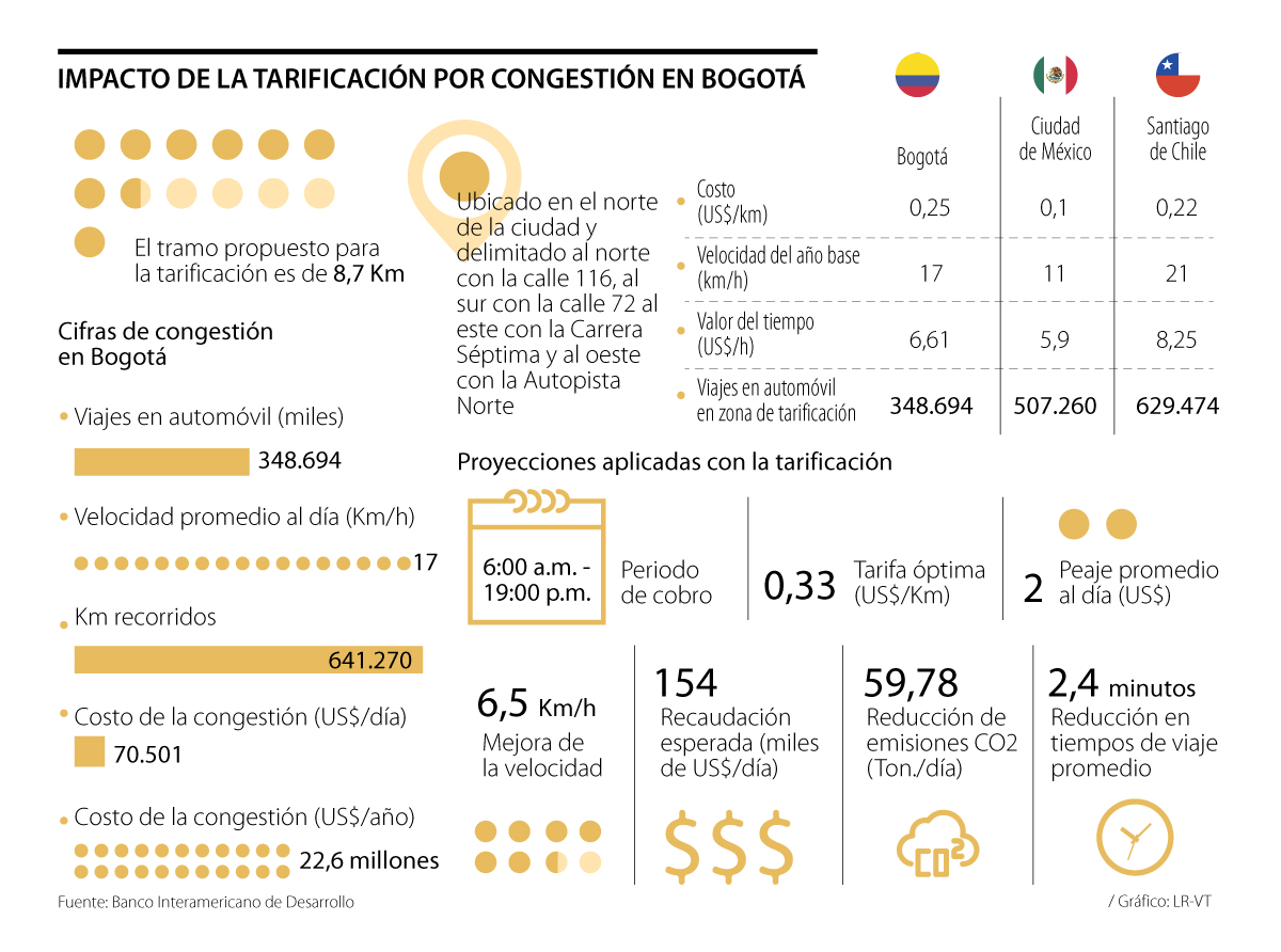 El BID propone una tarifa de US$0,33 para Bogotá, US$0,42 para Ciudad de México y US$0,94 para Santiago por kilómetro recorrido en la zona de congestión en un período de 12 horas. Así, se estima que el monto de la recaudación representa 16% de los ingresos de Bogotá por concepto de impuesto de vehículos, 40% para Santiago y 97% para Ciudad de México.