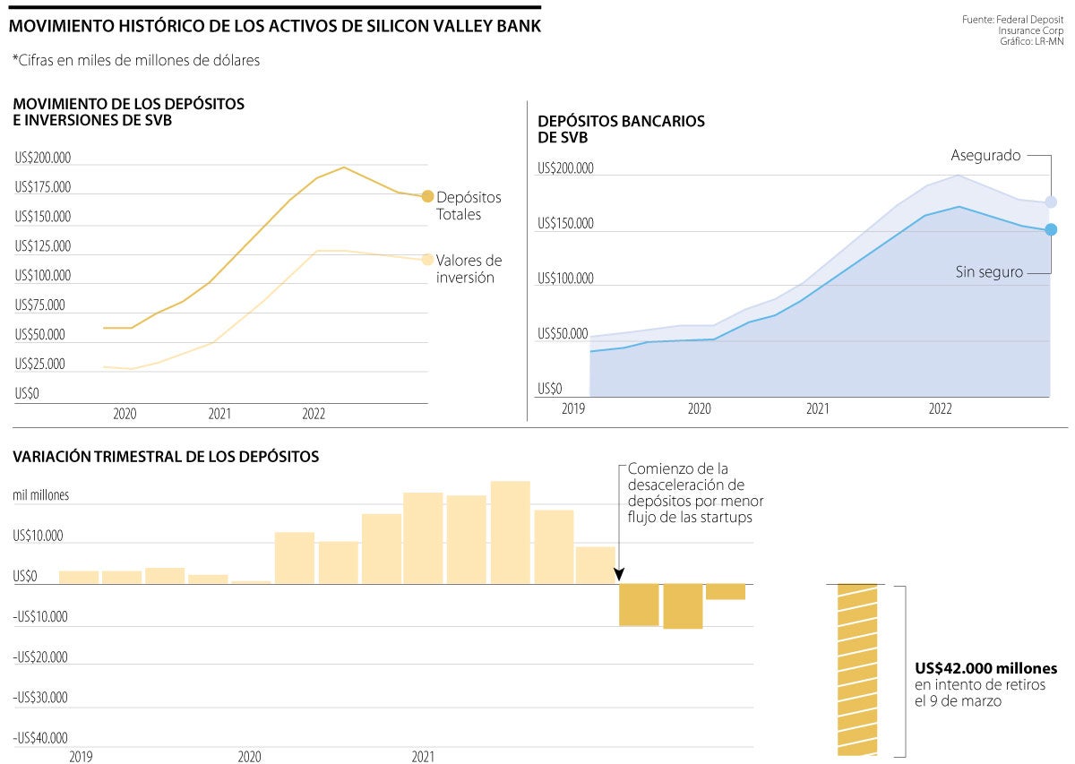 El banco de las startups que era un gran financiador de emprendimientos resultó con más depósitos de sus ahorradores que cartera de créditos. Es decir, tenía más plata de los clientes que préstamos que le generaran intereses y ganancias. Por esto, SVB Financial compró miles de millones en activos aparentemente seguros, principalmente bonos del Tesoro de EE.UU. a más largo plazo y valores hipotecarios respaldados por el Gobierno. La cartera de valores de SVB aumentó de US$27.000 millones en el primer trimestre de 2020 a US$128.000 millones a finales de 2021.