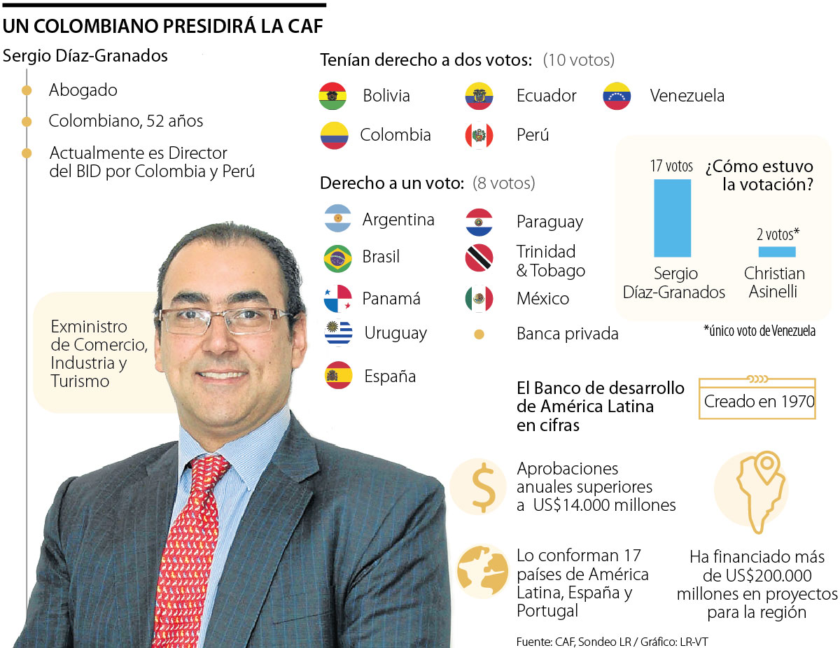 El abogado Sergio Díaz-Granados fue elegido como nuevo presidente del Banco de Desarrollo de América Latina (CAF) tras obtener 17 de los 19 votos permitidos, por lo que estará en el cargo por cinco años.