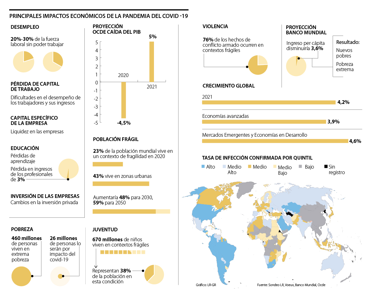 Las cifras de la Ocde señalan que cerca de 23% de la población mundial viviría en sectores vulnerables o contextos de mayor fragilidad. Por ello, la entidad señala que ad portas de la recuperación será primordial que los gobiernos centren sus esfuerzos en el desarrollo de esas zonas.