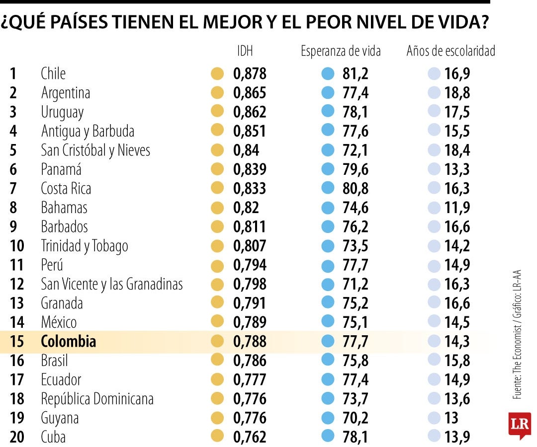En este mapa regional, Colombia aparece en una posición intermedia, con un IDH de 0.788, ubicándose en el puesto 15 de la región. El país tiene una esperanza de vida de 77.7 años, una cifra relativamente alta en comparación con el promedio global, y una escolaridad promedio de 14.3 años, lo que muestra avances importantes en acceso a educación en las últimas décadas.
