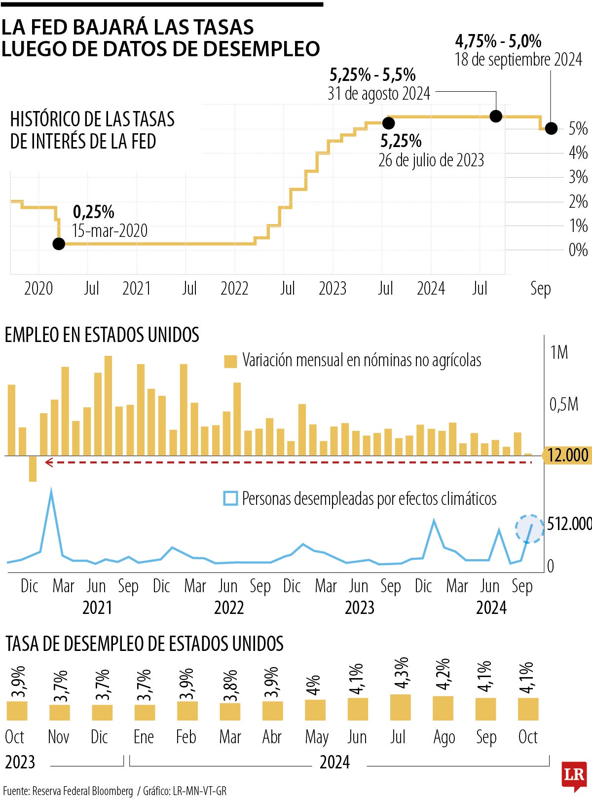 Economistas habían previsto un aumento de 113.000 puestos de trabajo para octubre.Las estimaciones oscilaban entre la ausencia de creación de empleo y 200.000 nuevos puestos. El huracán Helene devastó el sureste a finales de septiembre y el huracán Milton azotó Florida una semana después.