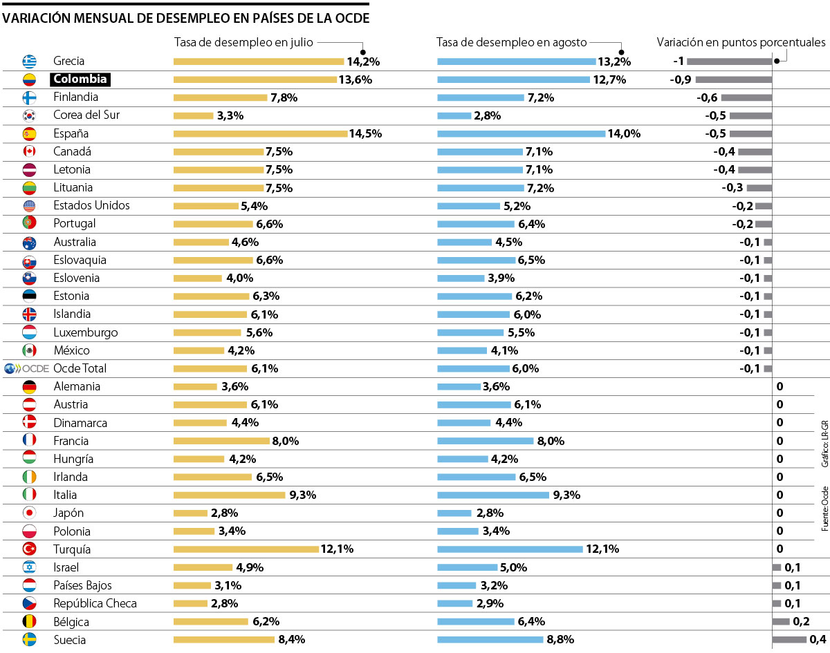 Después de Grecia, en Colombia se registró la mayor caída mensual de la tasa de desempleo entre los países miembros de la organización: se ubicó en 12,7% en agosto, desde el 13,6% que había marcado en julio.