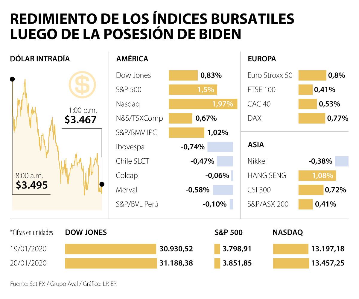 Luego del discurso de posesión del presidente Joe Biden, el dólar presentó una baja de $5,72 frente a la tasa representativa del mercado (TRM), que se ubicó en $3.482,03.