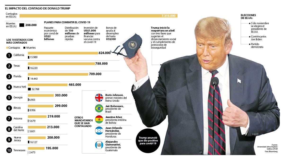 Estados Unidos es el país con mayor número de contagios por covid-19 en el mundo, y a la cifra se le sumó ayer el caso del presidente Donald Trump y su esposa Melania Trump, quienes anunciaron dar positivo en la prueba de coronavirus. Para los expertos esto podría prestarse para criticar los malos manejos que el gobierno norteamericano le ha dado a la pandemia y la ineficiencia de las medidas aplicadas a la fecha, pero también podría presentarse como una oportunidad para la imagen del mandatario.