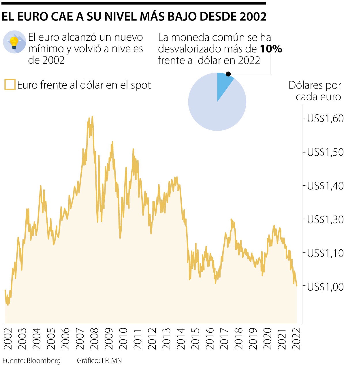 Los inversionistas están cada vez más convencidos el euro romperá la paridad con el dólar por las amenazas de recesión mundial