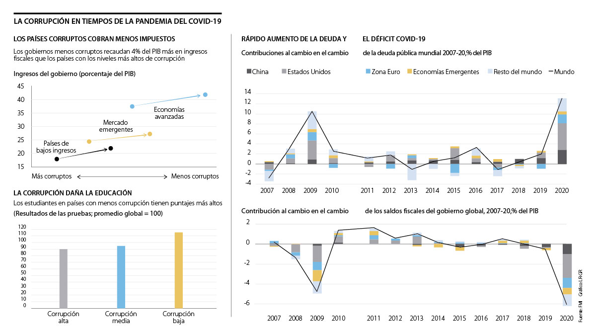 En medio de la cascada de alivios económicos que han anunciado los gobiernos alrededor del mundo se asoma el fantasma de la corrupción, el cual pone en riesgo la recuperación económica. Por ello, el Fondo Monetario Internacional (FMI) advirtió en la publicación titulada ‘Corrupción y covid-19’, que la pandemia ha aumentado el riesgo de la corrupción.