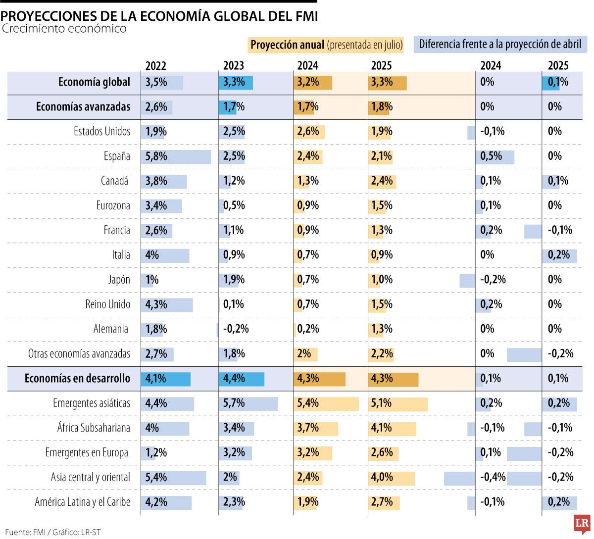 El Fondo Monetario Internacional, FMI, actualizó sus proyecciones de crecimiento económico frente a las anteriores que había publicado en abril de este año; el pronóstico de julio prevé 3,2% y 3,3% de aumento para 2024 y 2025 en la economía global. La proyección de 2024 se mantiene pero la de 2025 mejora al haberse ubicado en 3,2% en el reporte anterior.