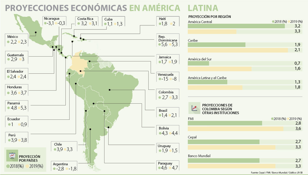 En medio de una oleada de proyecciones económicas de diferentes instituciones alrededor del mundo, la más reciente vino ayer de la mano de la Comisión Económica para América Latina y el Caribe (Cepal). En el caso colombiano, mantuvo sus perspectivas de 2,7%, igualando a las presentadas por el Banco Mundial hace algunas semanas. Sin embargo, la entidad más optimista en lo que se refiere al desempeño del país para finales de 2018 es el Fondo Monetario Internacional (FMI) que sitúa al país en alzas de 2,8%, cifra que tiene 0,1 puntos porcentuales más que el resto de cálculos.