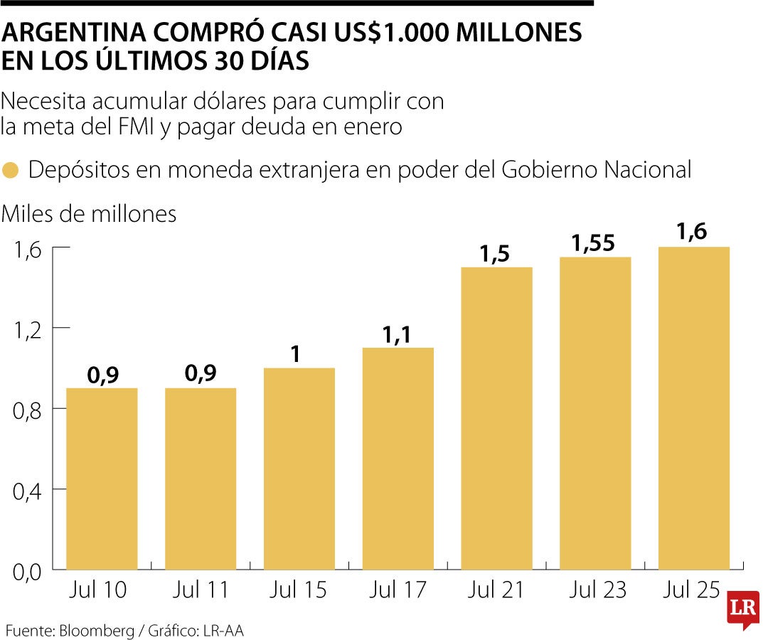 Argentina deberá elevar sus reservas netas de divisas a US$2.600 millones para finales de este año para desbloquear el siguiente tramo de fondos del FMI, unos US$5.000 millones menos que la meta anterior. La cifra se sitúa actualmente en US$6.400 millones, en parte debido al pago de un bono soberano el mes pasado.