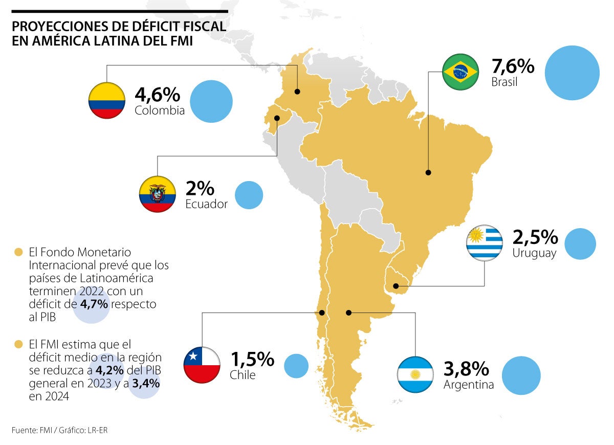 Según el informe vigilancia fiscal del FMI, se prevé que países como Brasil, que tiene uno de los descuadres más altos en la región, termine el año en 7,6%, y otros como Argentina con 3,8%, México con 3,2%, Uruguay con 2,5% y Perú con 2,4%.
