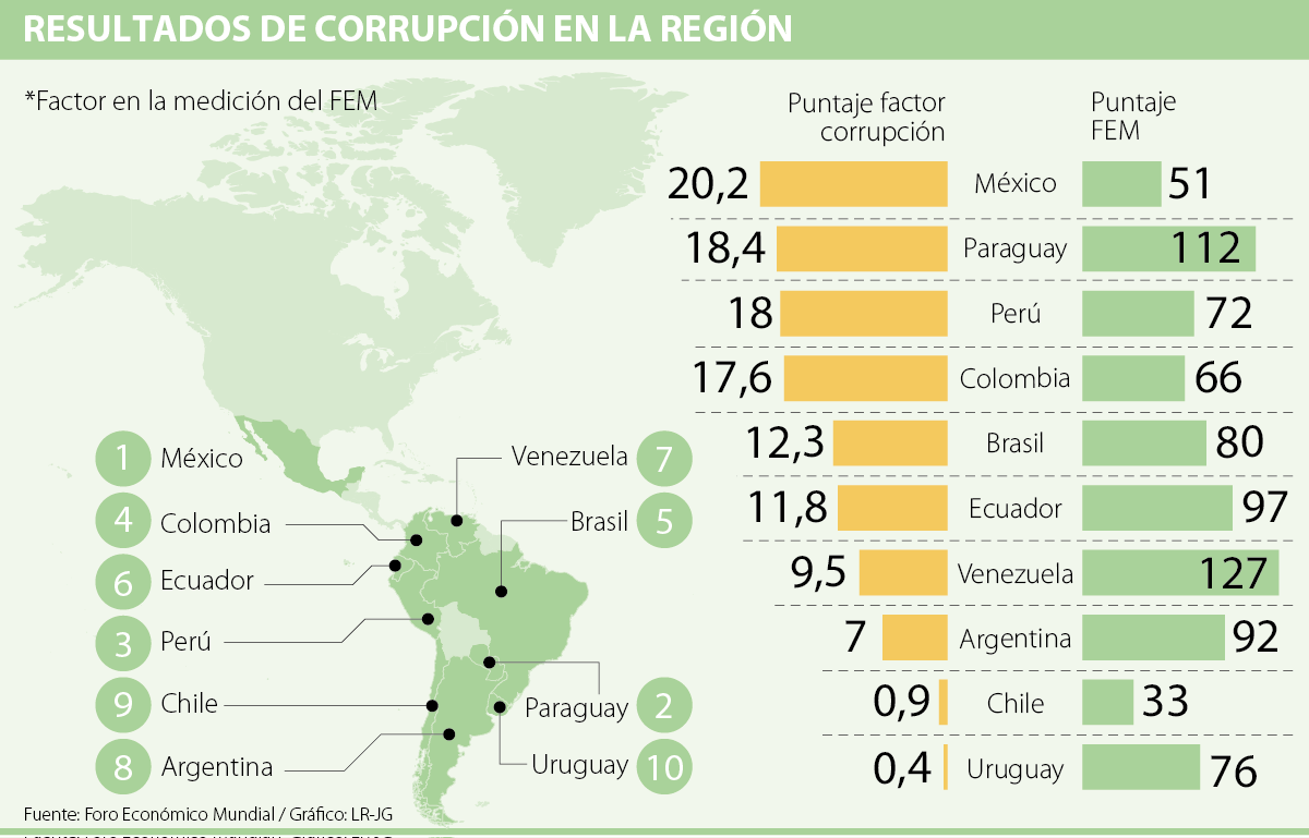 No obstante, al detallar las cifras del último informe de competitividad del Foro Económico Mundial se dio a conocer que hay una preocupación por el nivel de corrupción en la región, específicamente en países como México (20,2), Paraguay (18,4), Colombia (17,6) y Ecuador (1,8) con altos puntajes en este sentido. Por el contrario, las naciones con menores valores fueron Uruguay (0,4), Chile (0,9) y Argentina (7).