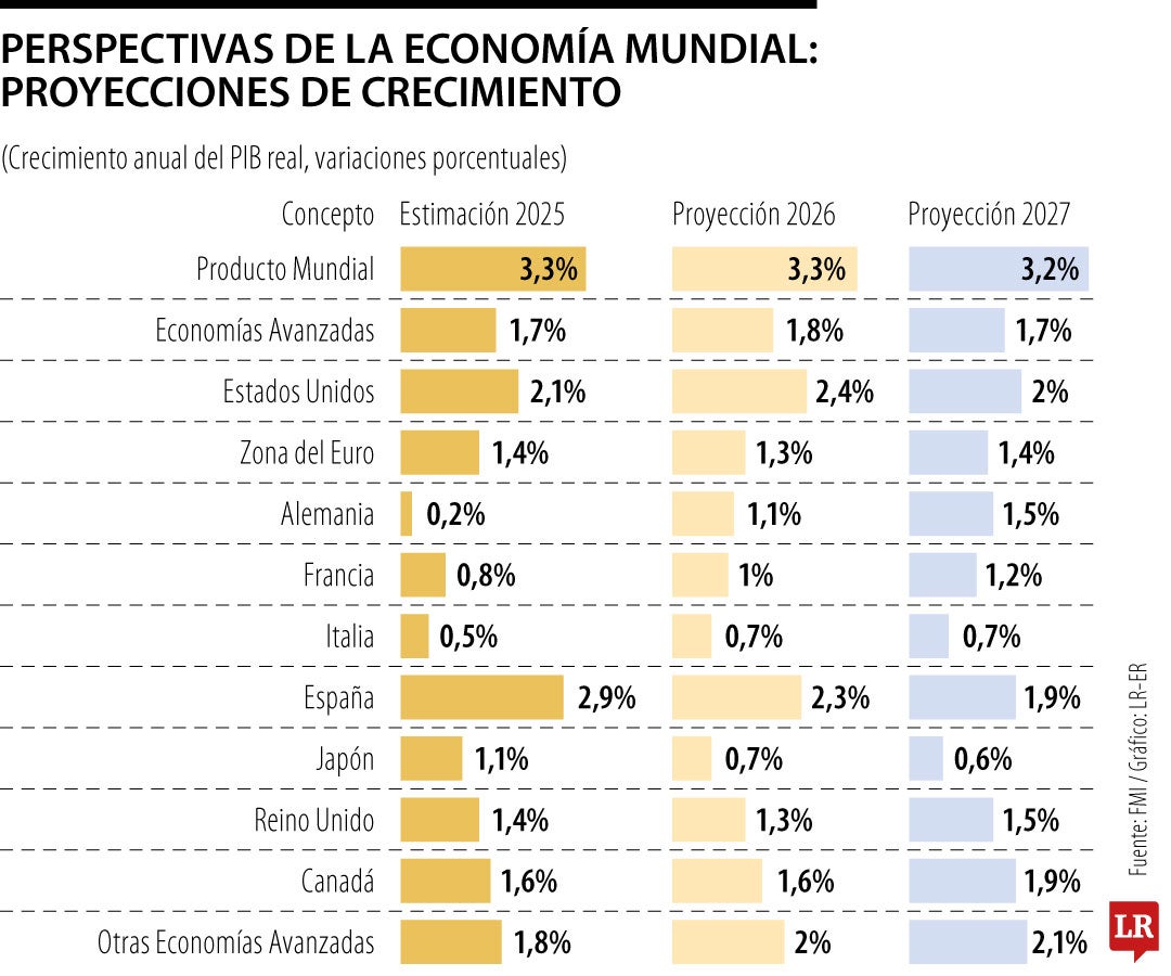 Según la entidad, el PIB global crecería 3,3% en 2026, y 3,2% en 2027, cifras ligeramente superiores a las proyectadas en octubre de 2025; esta mejora responde al impulso de la inversión en tecnología, especialmente en inteligencia artificial, a políticas fiscales y monetarias aún relativamente acomodaticias y a la reconfiguración de las cadenas de suministro ante los cambios en la política comercial de EE.UU.