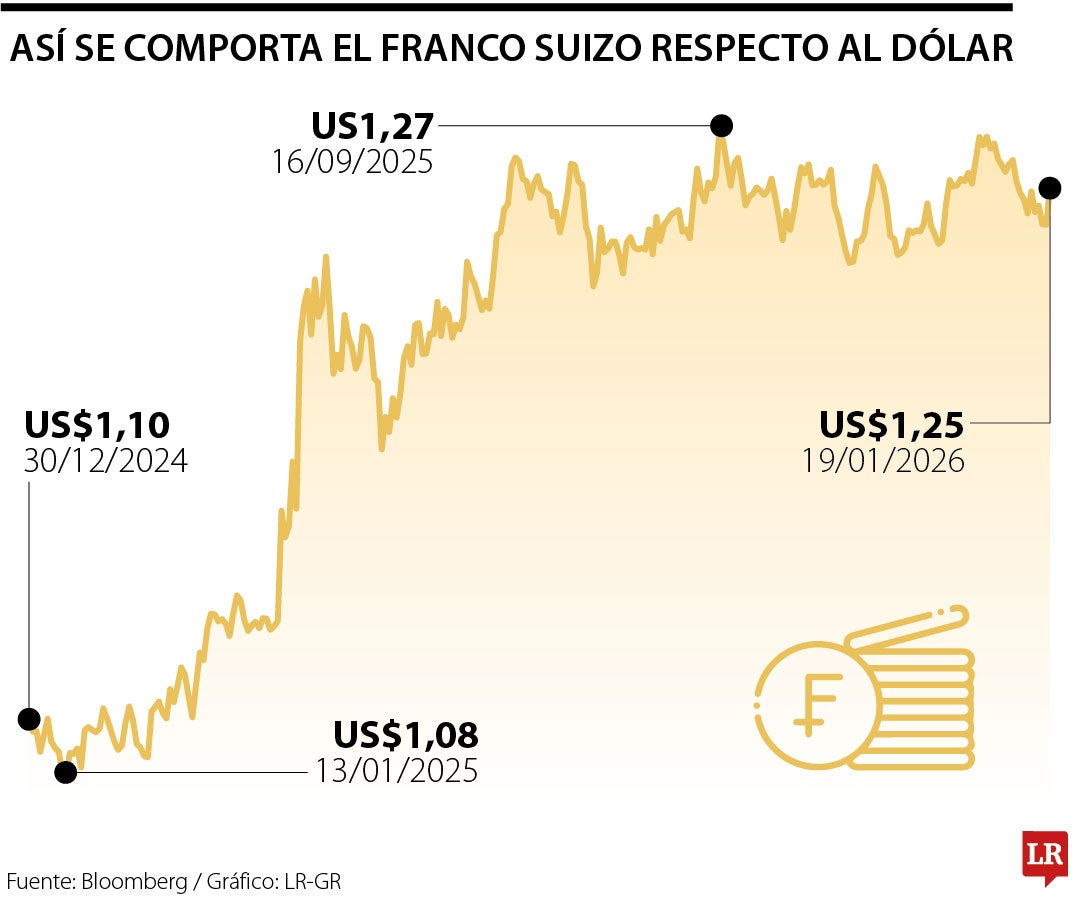 Los impactantes anuncios arancelarios de Trump en abril del año pasado impulsaron a los inversores a buscar más allá de la tradicional seguridad del dólar, lo que reforzó el atractivo del franco. Este impulso se intensificó tras el fin de semana, con el nuevo ultimátum de Trump sobre Groenlandia, que provocó la caída de activos de mayor riesgo, como las acciones, a nivel mundial, a la vez que desencadenó un repunte del oro.