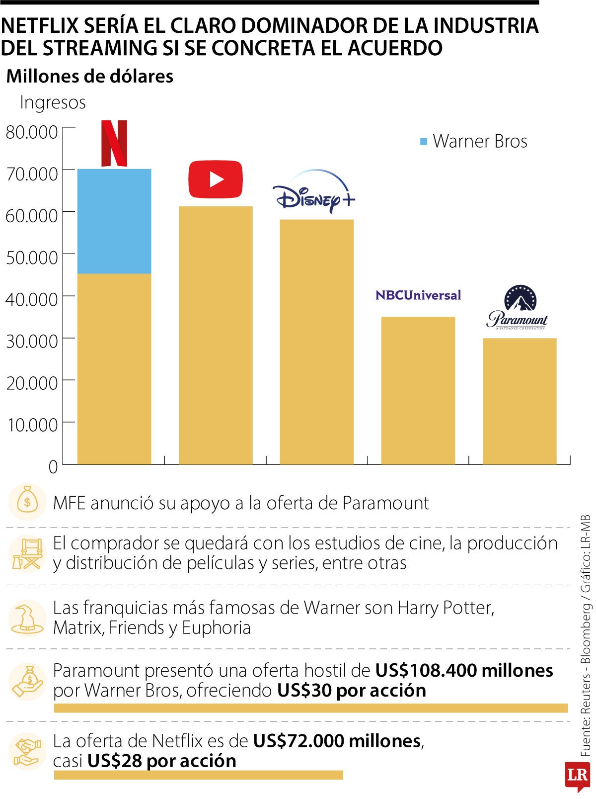Pero el escenario cambió drásticamente cuando Paramount dio un golpe sobre la mesa y presentó una oferta hostil de US$108.400 millones para adquirir la totalidad de Warner Bros. Discovery, no solo una parte de sus activos como planteó Netflix. Su propuesta contempla US$30 por acción, una fórmula agresiva que busca atraer directamente a los accionistas y desplazar cualquier negociación alternativa.