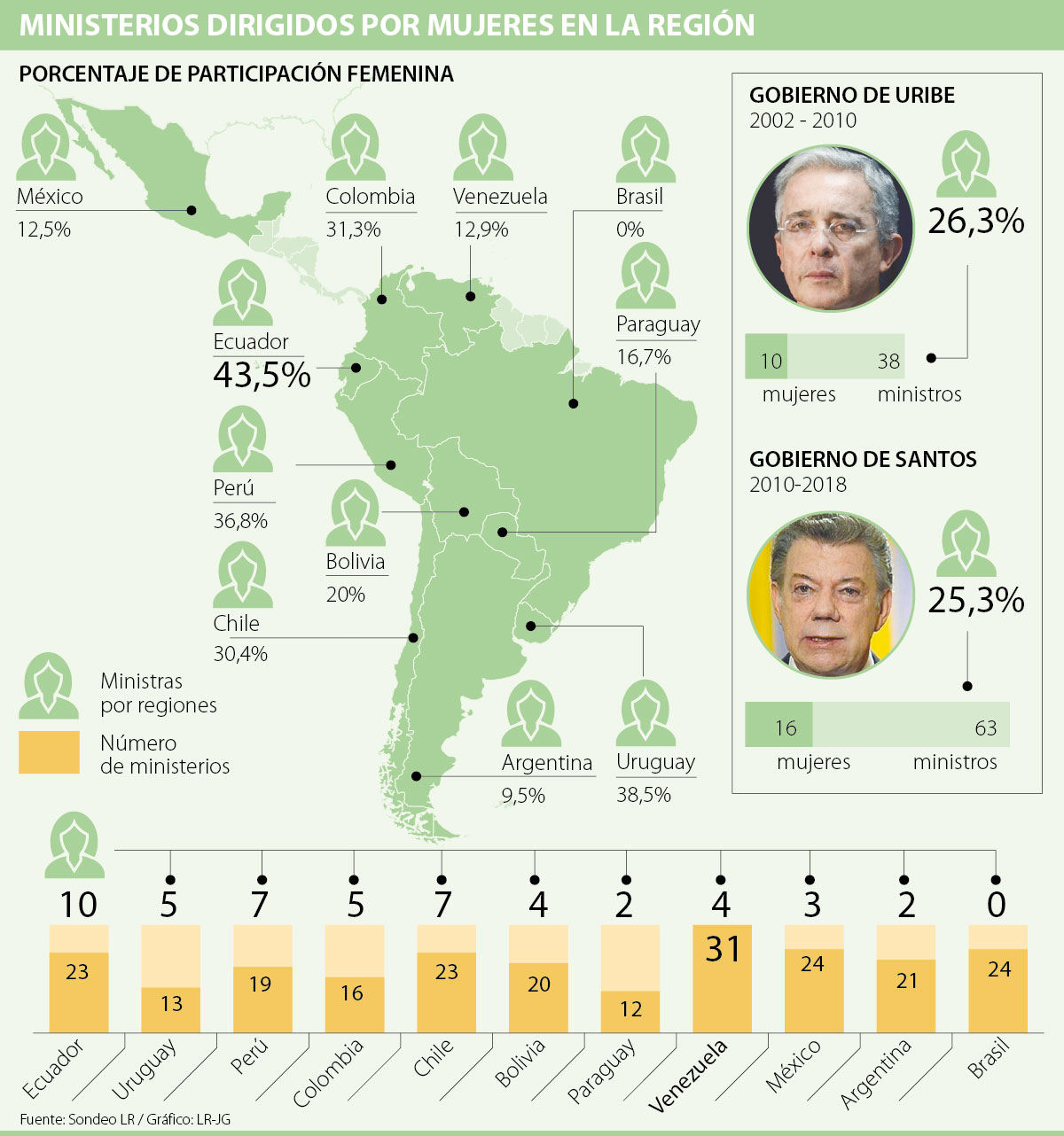 A Ecuador le siguen Uruguay y Perú, con 38,5% y 36,8% de participación femenina respectivamente. Colombia es el cuarto país de la región que mayor porcentaje de mujeres tiene en su gabinete: de 16 ministerios, cinco son dirigidos por mujeres, para un total de 31,3% de su composición. Las ministras María Lorena Gutiérrez, en Comercio, Industria y Turismo; María Ángela Holguín, en la Cancillería; Griselda Restrepo, en Trabajo; y Yaneth Giha, en Educación, son los ejemplos de las ministras locales.