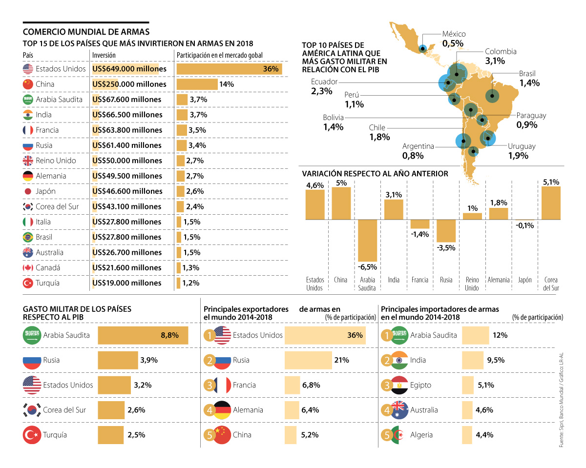 El tercer país que lidera en la lista de inversión en este rubro, es Arabia Saudita, además de destinar 8,8% del PIB para ello. Peckel considera que esto se debe a varios factores, “ primero porque tiene la plata, segundo porque le da estatus, tercero porque le da una sensación de protección y cuarto porque está enfrentando un conflicto geopolítico con Irán que tiene varios escenarios en este momento. Por lo tanto, Arabia Saudita es un régimen bastante vulnerable, sin embargo un exceso de compra de armas en un país como ese no es garantía de supervivencia”.